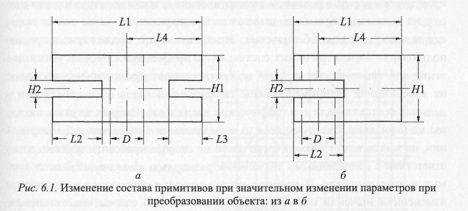 Данная проблема параметризации чертежей обычно возникает при необходимости варьировать параметры объекта в широких пределах. В такой ситуации возможно не только изменение параметров графических примитивов, описывающих объект, но и изменение состава этих примитивов (исключение 105 или добавление их). Наиболее часто встречающийся пример изменения состава примитивов - удаление некоторых из них в связи с вырождением. Так, например, если конструктор задает нулевой радиус какого-либо отверстия, то после модификации на чертеже не должно остаться ни примитива, описывающего это отверстие, ни самого размера с нулевым значением. Появление новых примитивов в составе чертежа обычно связано с преобразованиями объектов сложной формы, которые содержат вырезы и отверстия.